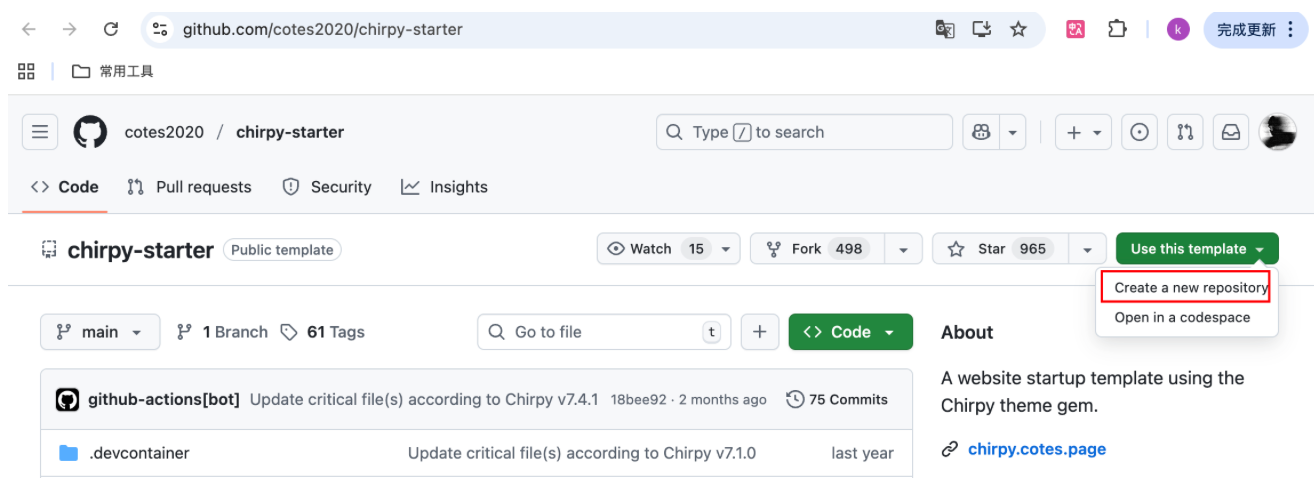 使用Chirpy主题作者创建的Chirpy Starter 模板创建一个新的 GitHub 仓库存储blog内容。