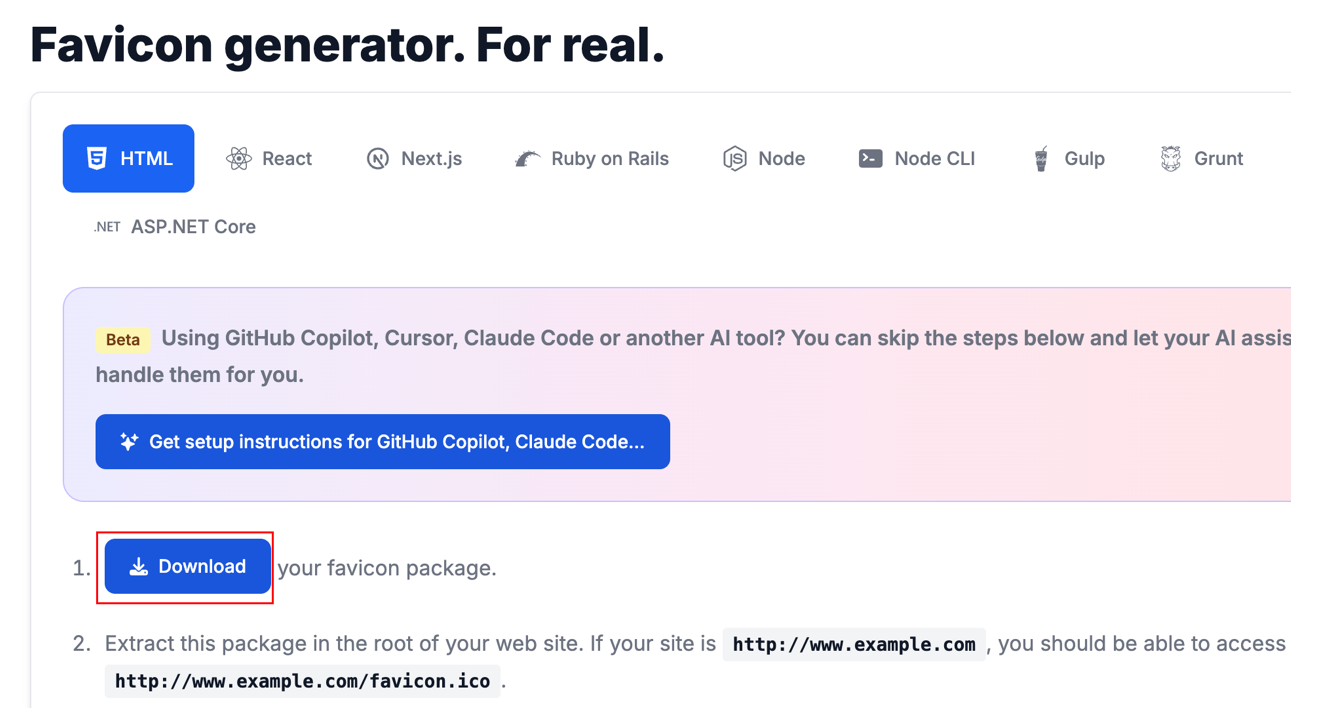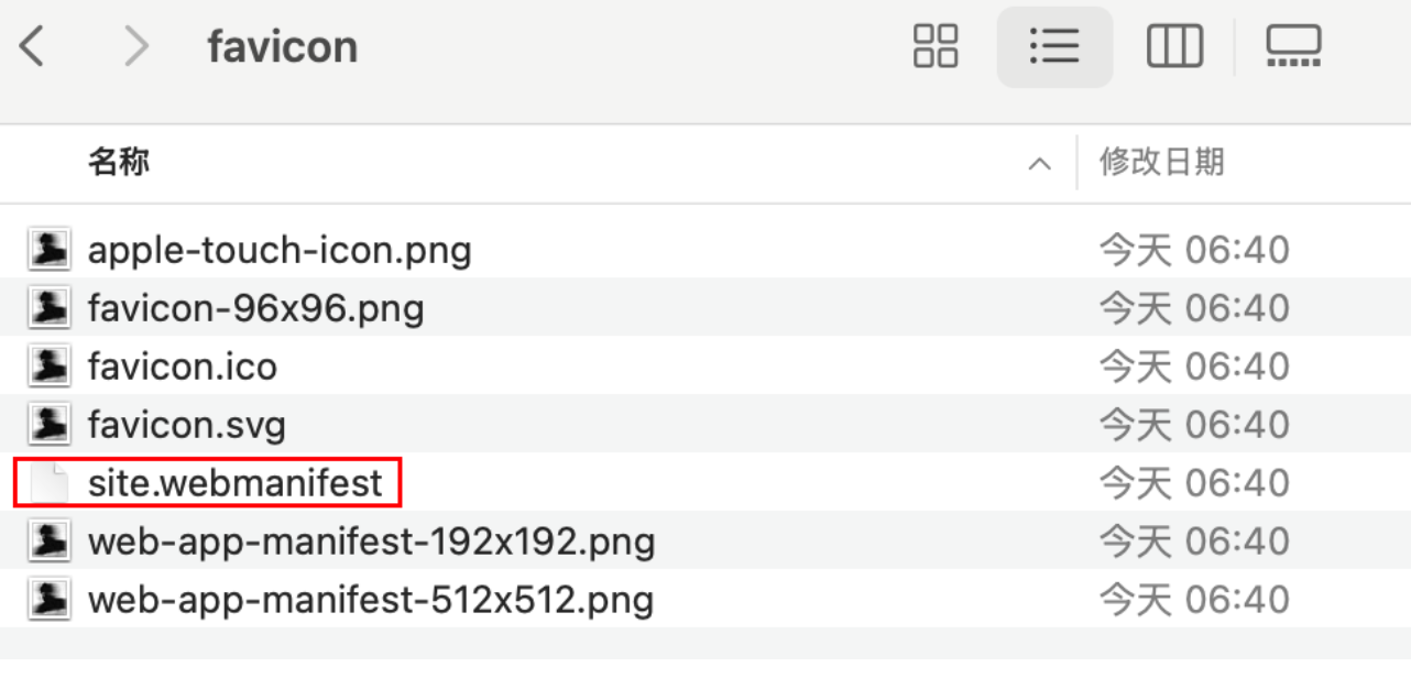 下载生成的压缩包,解压后删除site.webmanifest文件,复制剩余的图片文件(.PNG 和 .ICO)到 assets/img/favicons/ 目录中。如果Jekyll 网站没有此目录,创建一个即可