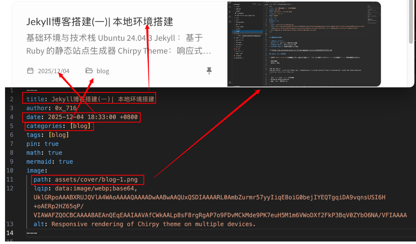 Jekyll 中的每篇blog都以front matter开头,一个被 --- 包围的YAML内容,,包含该帖子的元数据。这些元数据指导了 Jekyll 如何处理和显示内容。