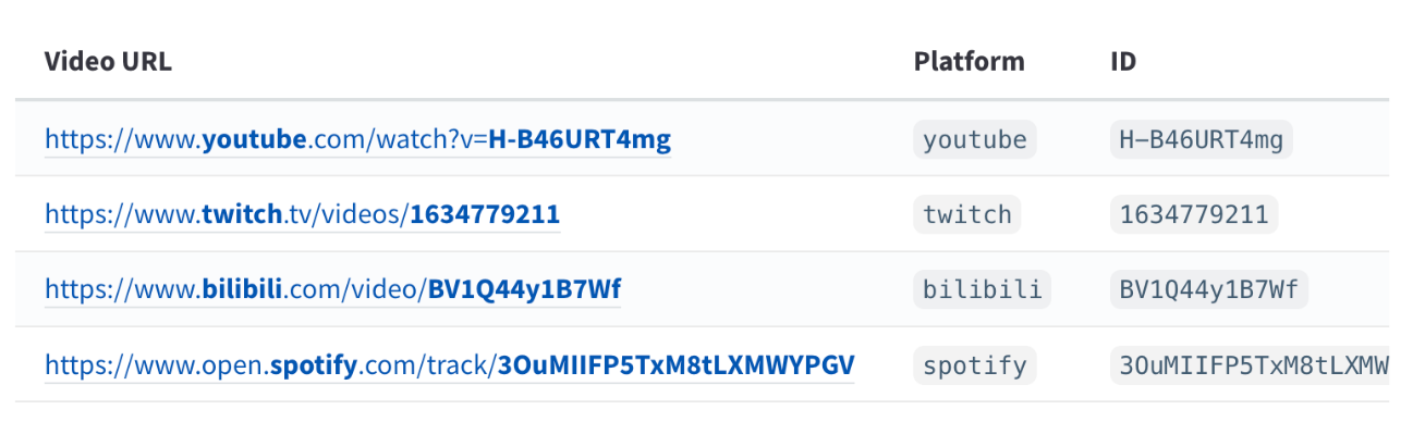 其中platform 是平台名称的小写,ID 是音视频ID,目前支持的平台如下